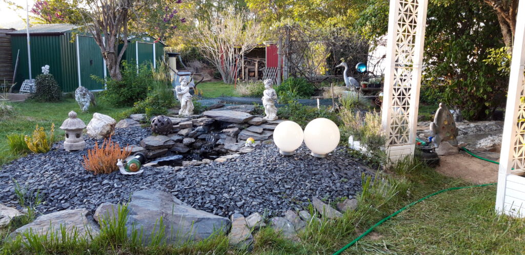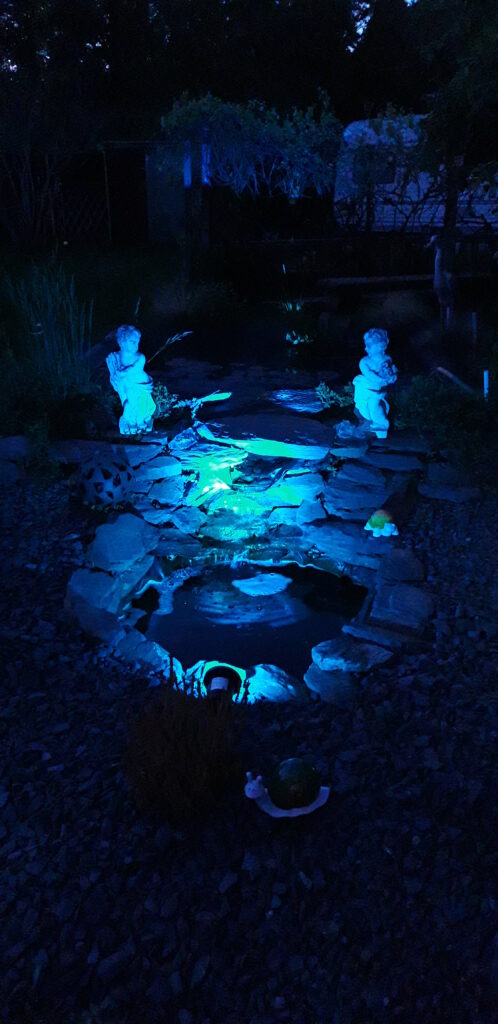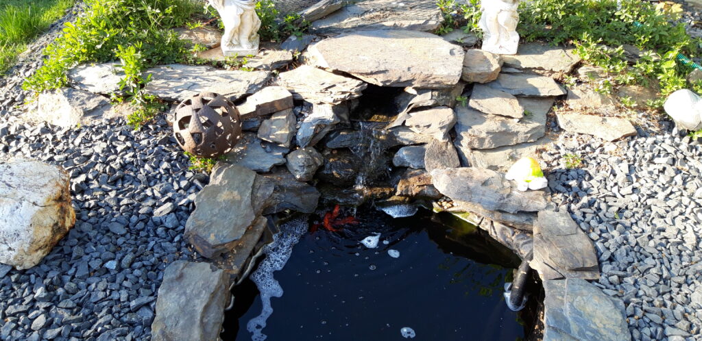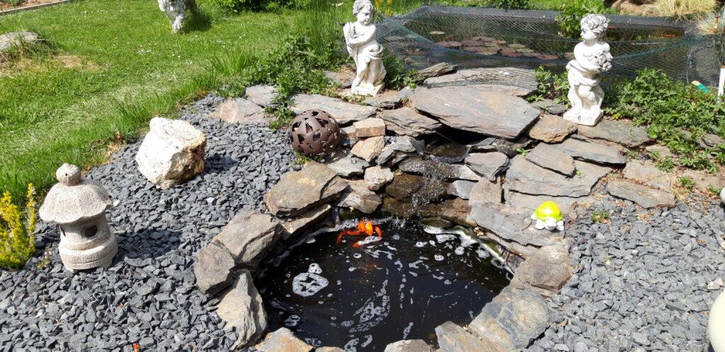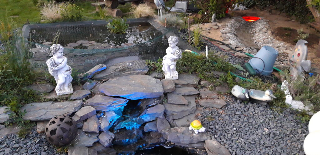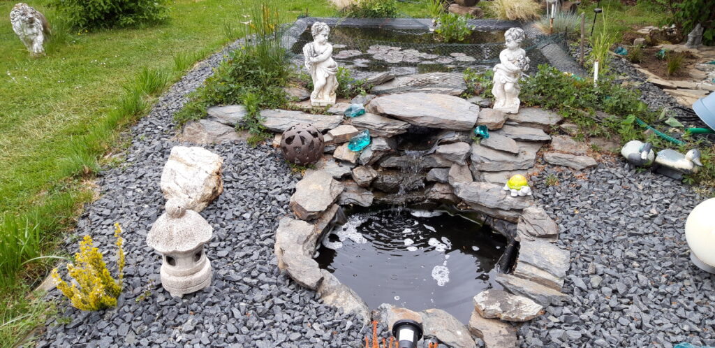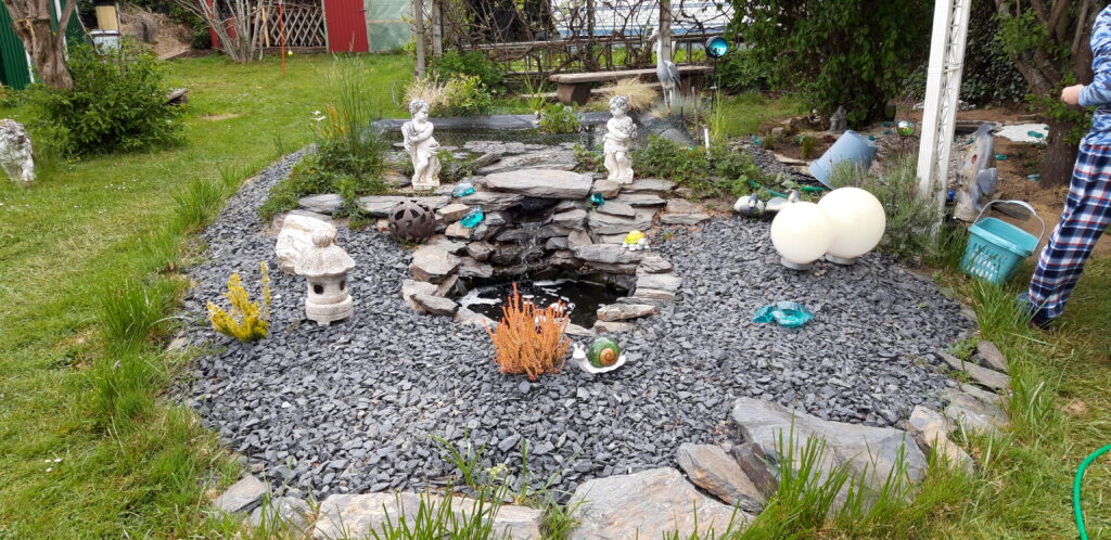 Die Aufgabe war, aus einem stehenden Tümpel, einen brauchbaren kleinen Fischteich herzustellen. Dabei sollte der eigentliche Teich unangetastet bleiben. Hierbei habe ich ein kleines Rücklaufbecken hergestellt, welches vom ursprünglichen Teich, über einen kleinen Wasserfall aus Schiefer versorgt wird. Die Rückführung des Wassers erfolgte über Pumpe und Filter. Weiter gab es noch ein wenig Deko und Beleuchtung für’s Auge.